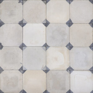 Alte keramische Bodenfliesen im Hauptbahnhofsstil, mit konvexer und konkaver Form in den Farben Creme und Grün. Mit passendem Rand/Rand.