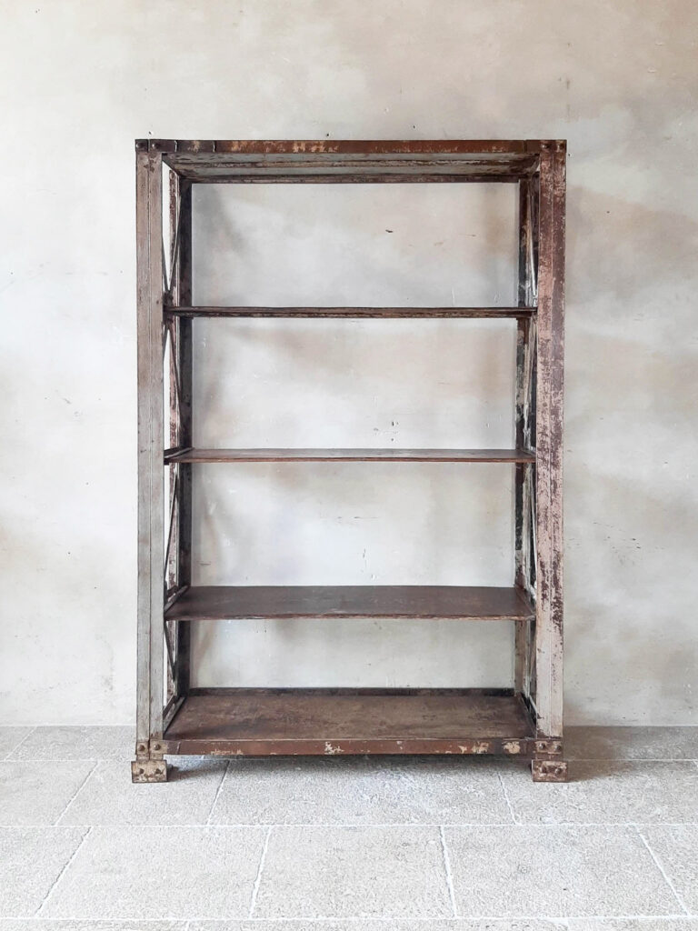 Altes Industrieregal. Offener Wandschrank aus grau patiniertem Stahl. Schwere, genietete Industrieregale aus Schmiedeeisen. Perfekt für die Ladeneinrichtung und die Ladenauslage.