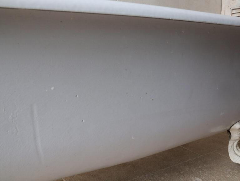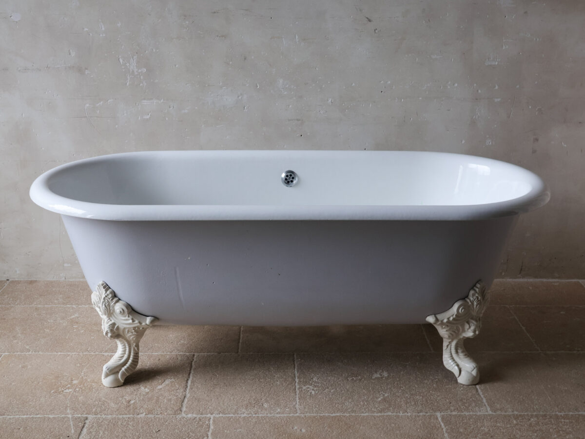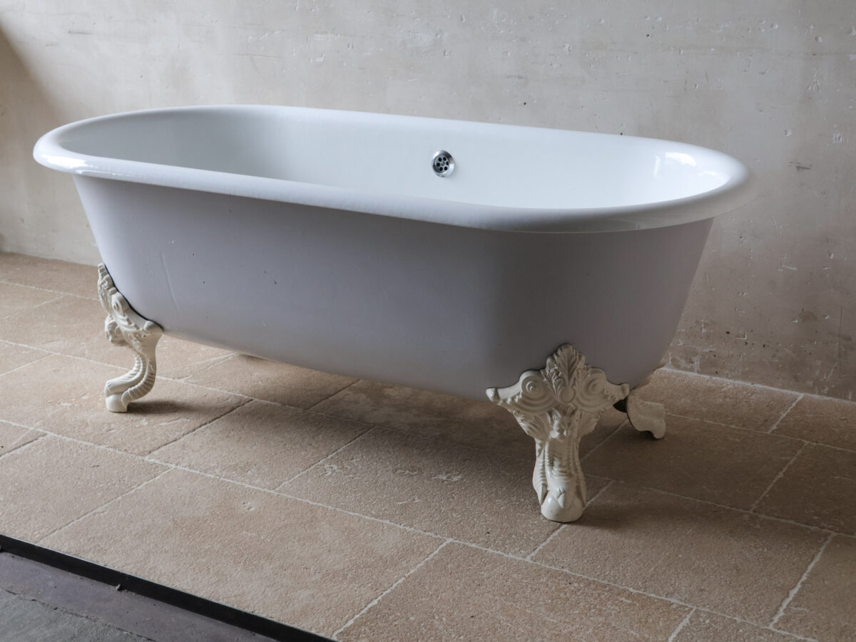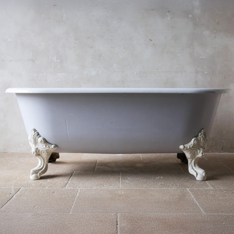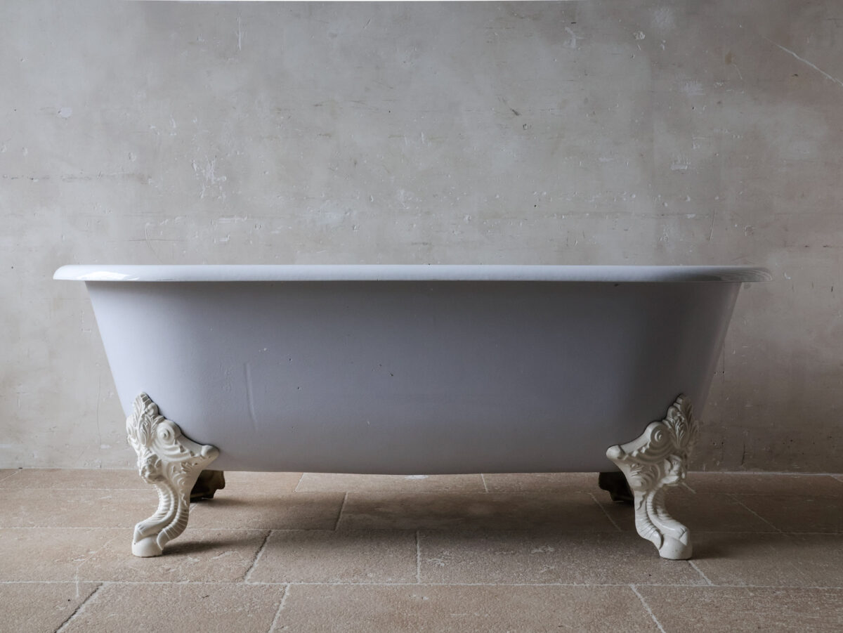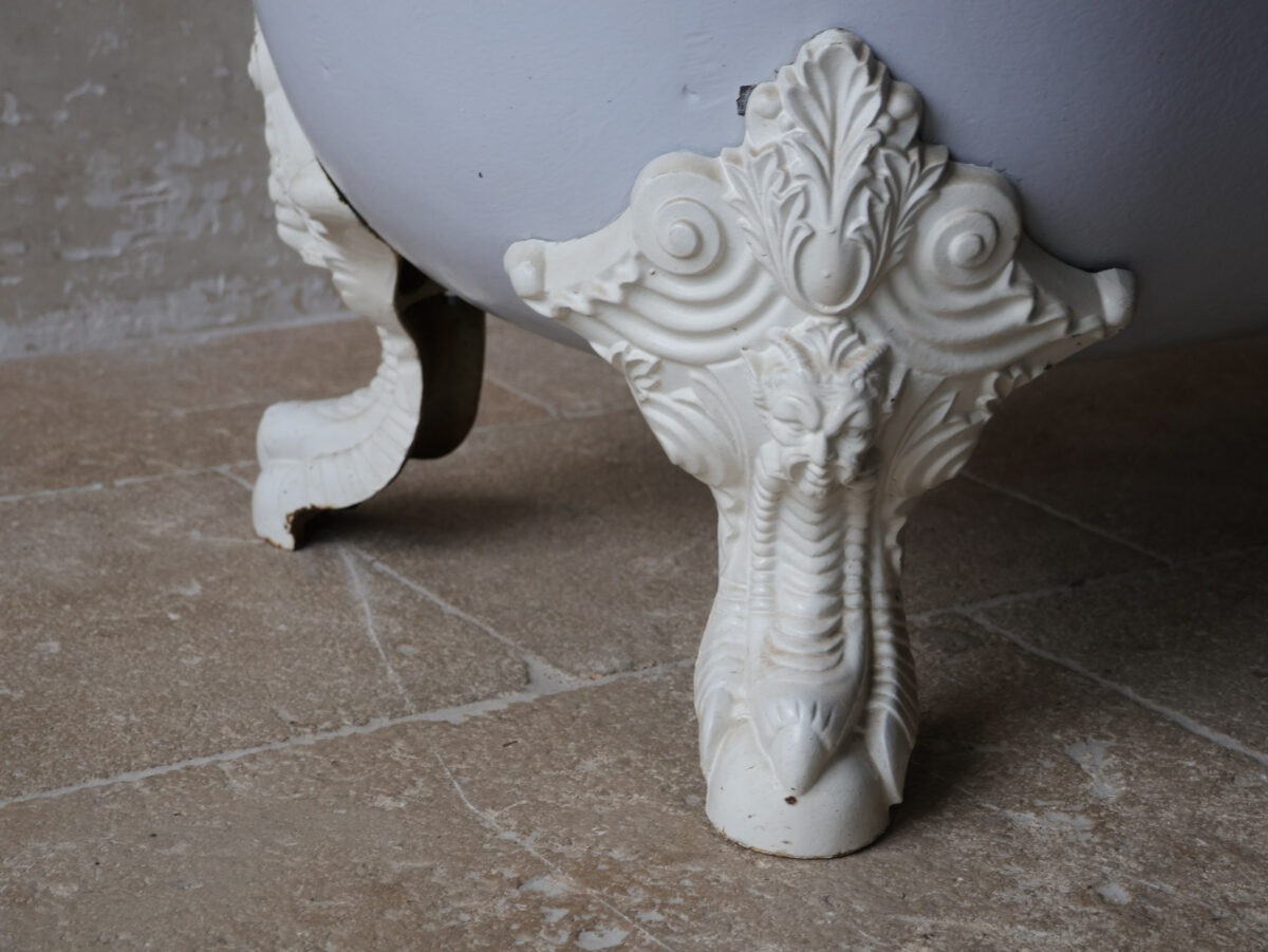 Antike Gusseisen Badewanne mit weißer Emaille-Innenseite und hellgrau lackierter Außenseite. Die freistehende Wanne ruht auf vier wunderschön verzierten, weißen Klauenfüßen. Der Abfluss befindet sich mittig.