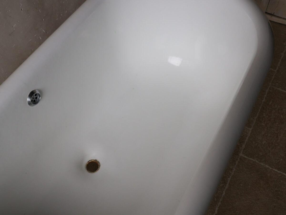 Zustand: Die Wanne befindet sich in gutem, gebrauchtem Zustand. Das emaillierte Innenbecken weist leichte Sprenkel und kleine, oberflächliche Kratzer auf, die dem Alter und dem Charakter des antiken Stücks entsprechen. Die Außenlackierung hat einige kleinere Unebenheiten (siehe Detailfotos).
