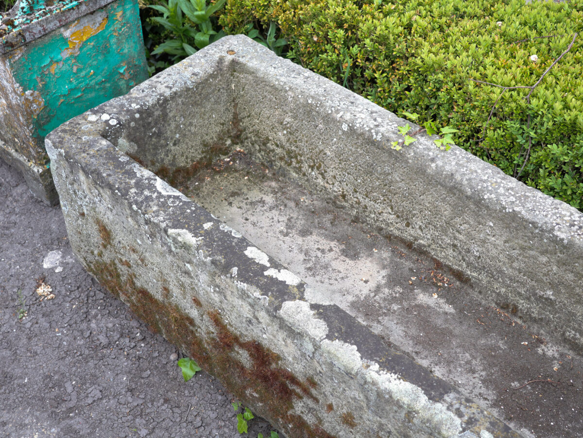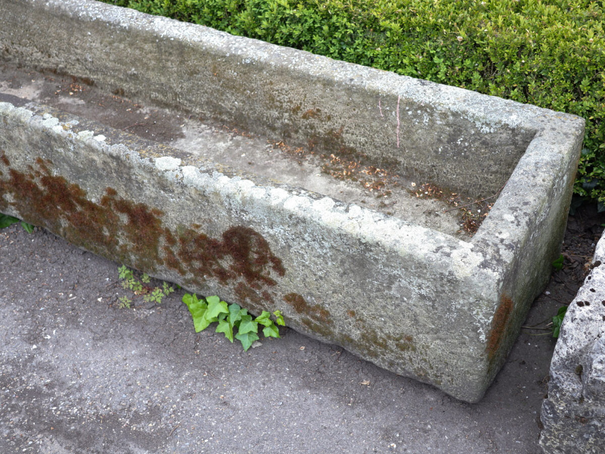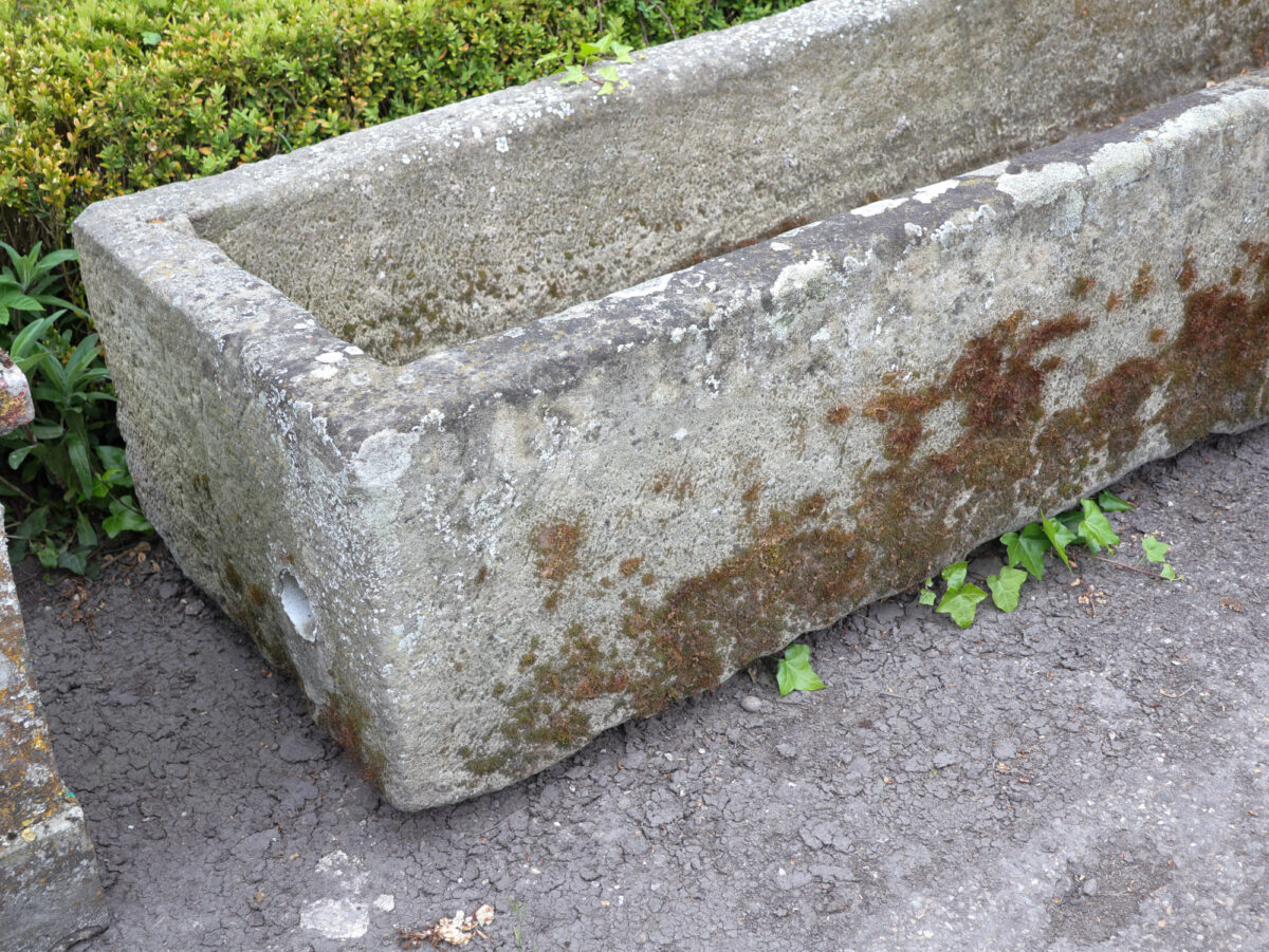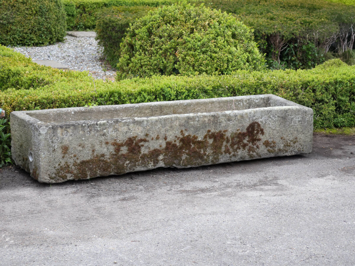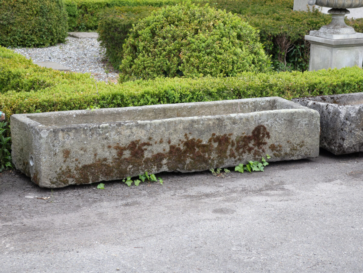 Authentischer langer antiker französischer Kalksteintrog, charakterisiert durch seine robuste rechteckige Form und die natürliche Verwitterung des Kalksteins. Der Trog besitzt eine alte Patina mit moosigen Akzenten, die seine lange Geschichte bezeugt. Ein Abflussloch an der Seite erinnert an seine ursprüngliche Funktion, möglicherweise als Tränke oder Spülbecken. Dieses stimmungsvolle Element ist ideal als einzigartiges Pflanzgefäß für längliche Gewächse oder als rustikales Wasserelement für Ihren Garten oder Außenbereich.