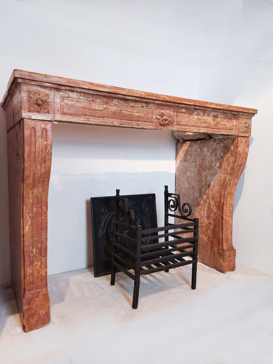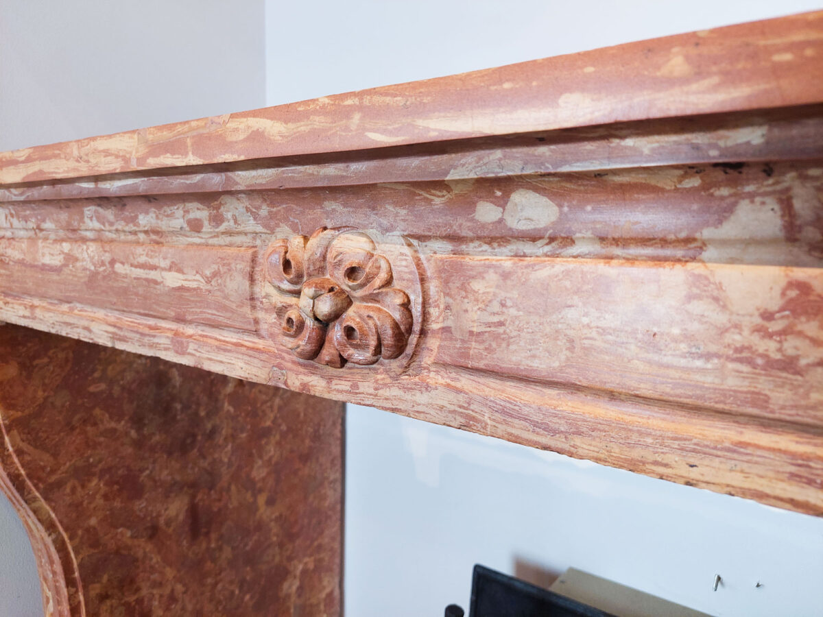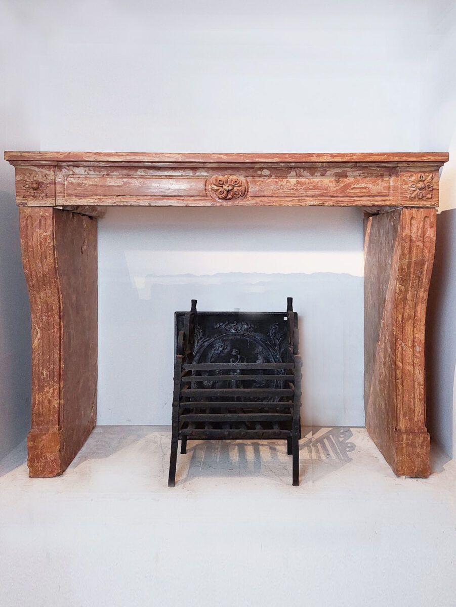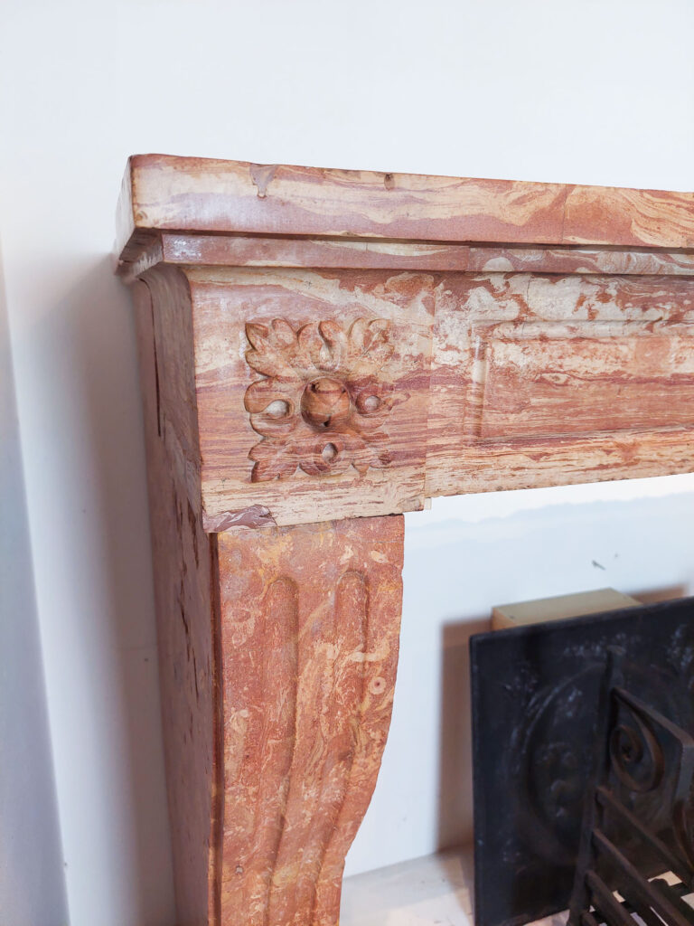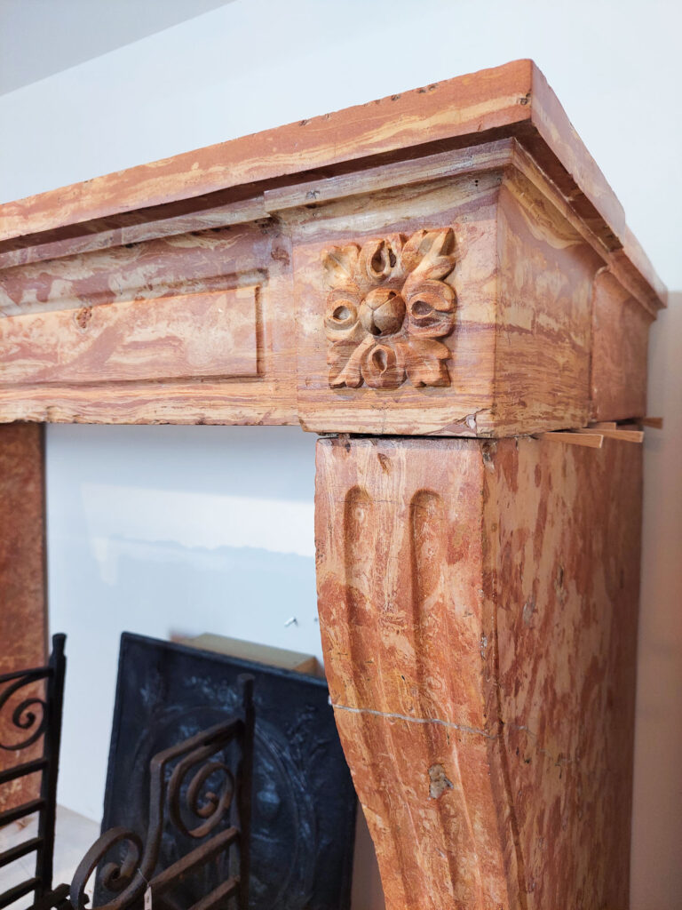 Antiker französischer Pierre de Bourgogne-Kamin in Terra-Tönen (Orange-Rot und Gelb). Dieser Kamin im Louis XVI-Stil hat geriffelte Stile und Rosetten an den Ecken. Die Vorderseite mit Paneelen und einer ovalen Rosette als zentralem Ornament.
