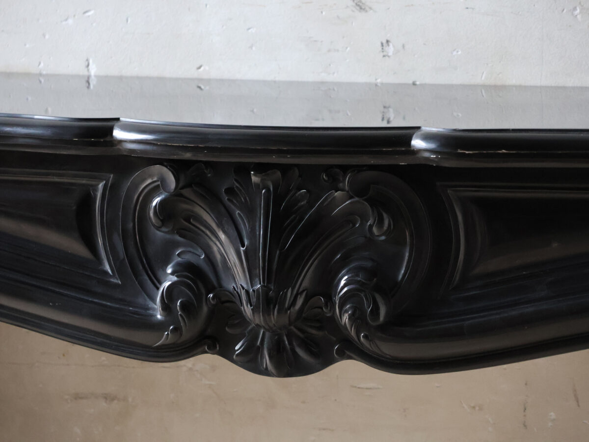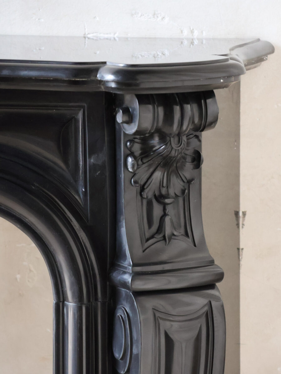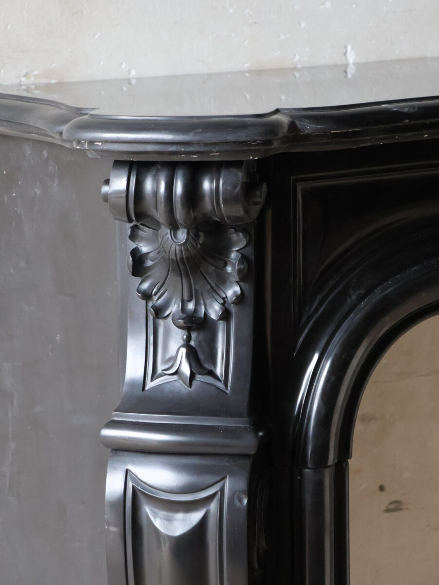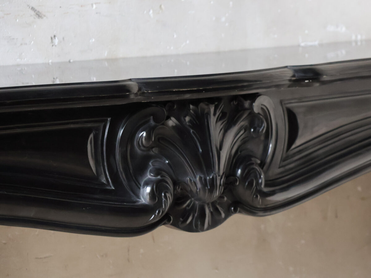 Zentral auf der Vorderseite befindet sich ein klassisches Muschelornament, während die Seiten mit raffinierten Blattmotiven verziert sind. Die Kaminpfosten besitzen eine elegante, gebogene Form und enden in klar ausgeführten Sockeln. Das polierte Noir-de-Mazy-Marmor verleiht dem Kamin einen dezenten Glanz und betont die intensive schwarze Farbgebung auf besonders schöne Weise.