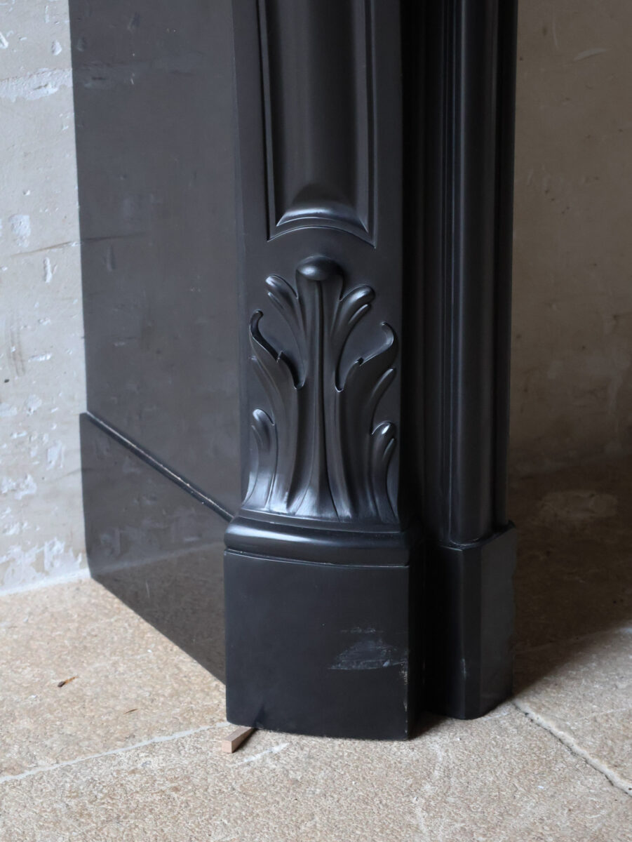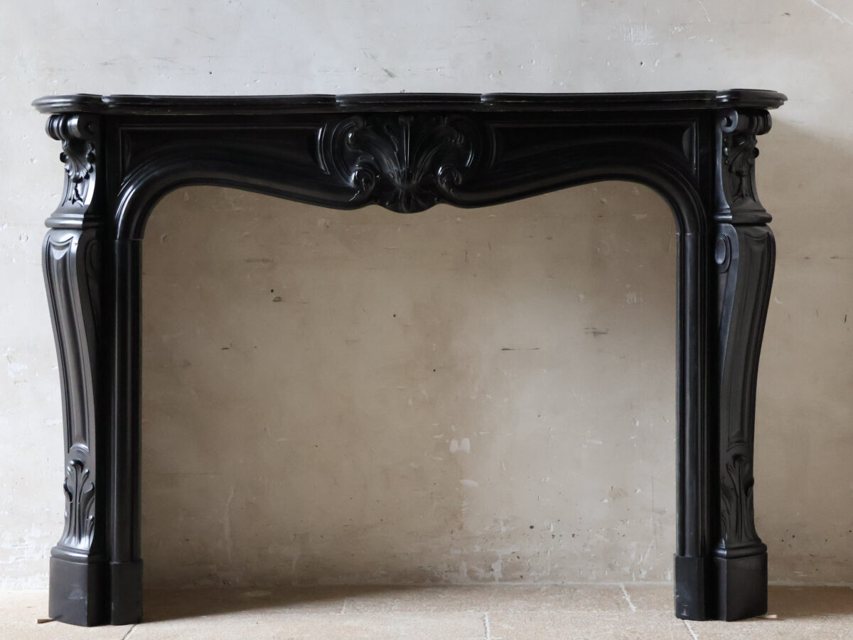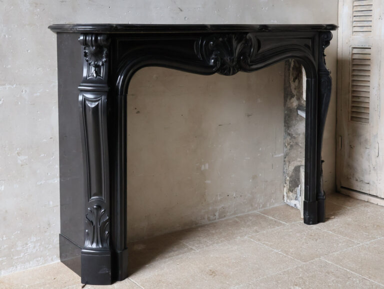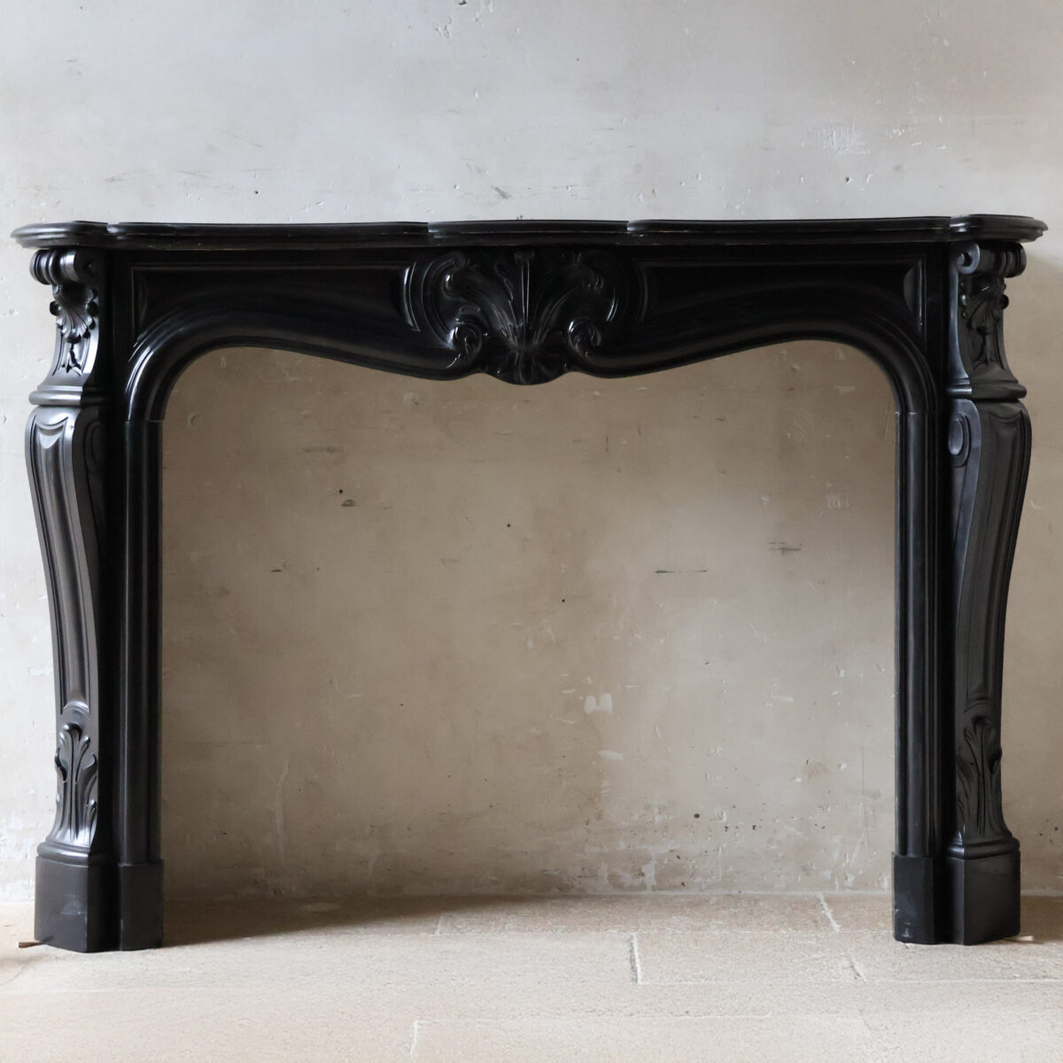 Zentral auf der Vorderseite befindet sich ein klassisches Muschelornament, während die Seiten mit raffinierten Blattmotiven verziert sind. Die Kaminpfosten besitzen eine elegante, gebogene Form und enden in klar ausgeführten Sockeln. Das polierte Noir-de-Mazy-Marmor verleiht dem Kamin einen dezenten Glanz und betont die intensive schwarze Farbgebung auf besonders schöne Weise.