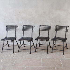 Faux Bois Gartensitz bestehend aus einem Tisch und drei Bänken. Der Tisch ist 114 cm im Durchmesser und 73 cm hoch. Die drei Bänke sind leicht gebogen, so dass sie gut um den runden Tisch herum stehen können. Die Bänke sind 136 cm breit, 41 cm tief und 44 cm hoch.