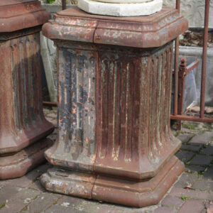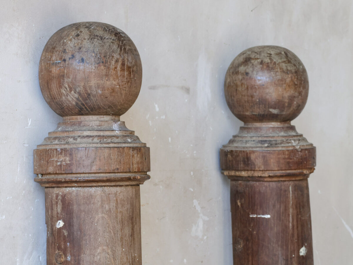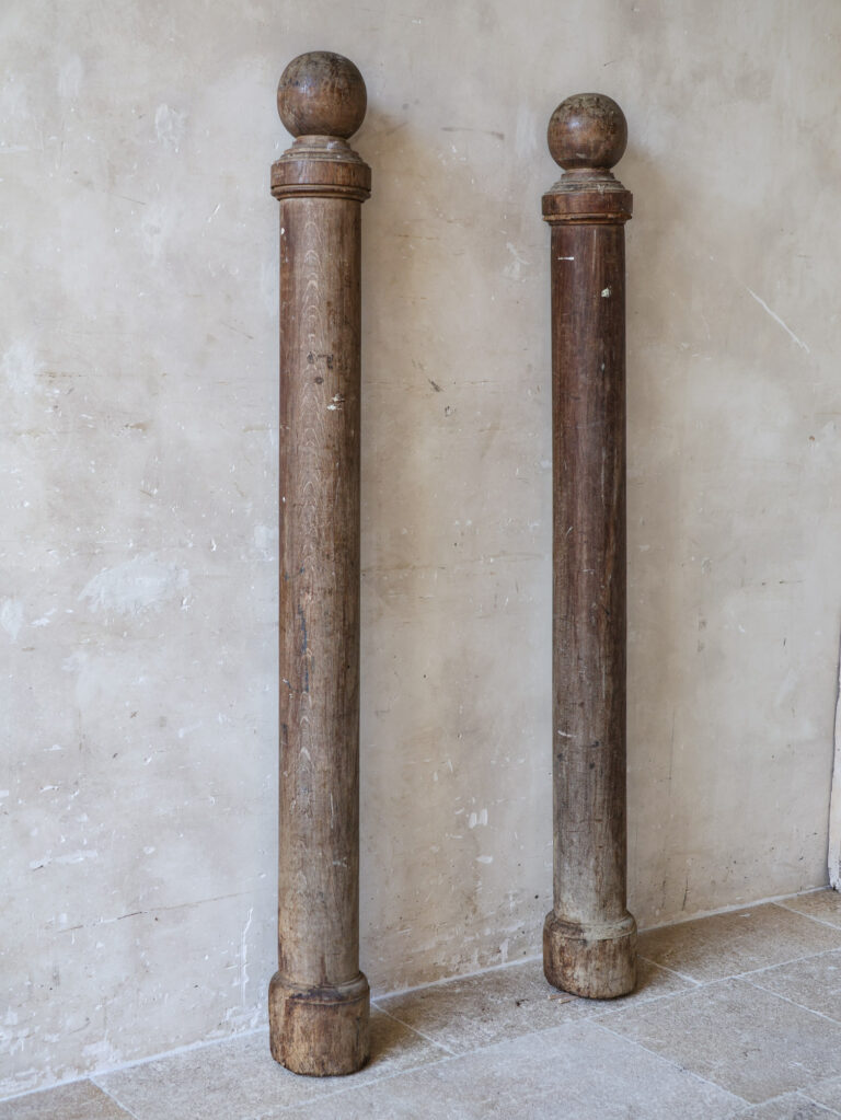 Paar antike Eichenholzsäulen. Diese wunderschönen Säulen sind aus altem Eichenholz gefertigt und mit einer abgerundeten, kugelförmigen Spitze versehen. Sie eignen sich für den Einsatz in Ställen, Zäunen oder als dekorative Elemente. Auf der Rückseite ist eine Aussparung sichtbar, die zeigt, wo sie früher Teil eines Zauns waren. Perfekt als dekorative Pfosten oder authentische Endstücke.