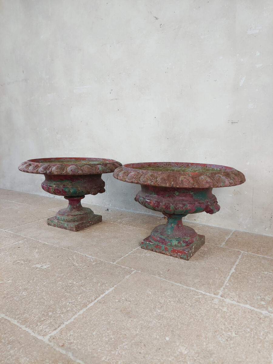 Paar antike Gartenvasen aus Gusseisen mit roter und grüner Patina.