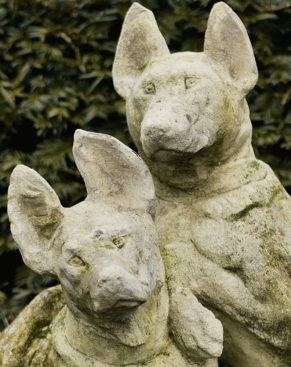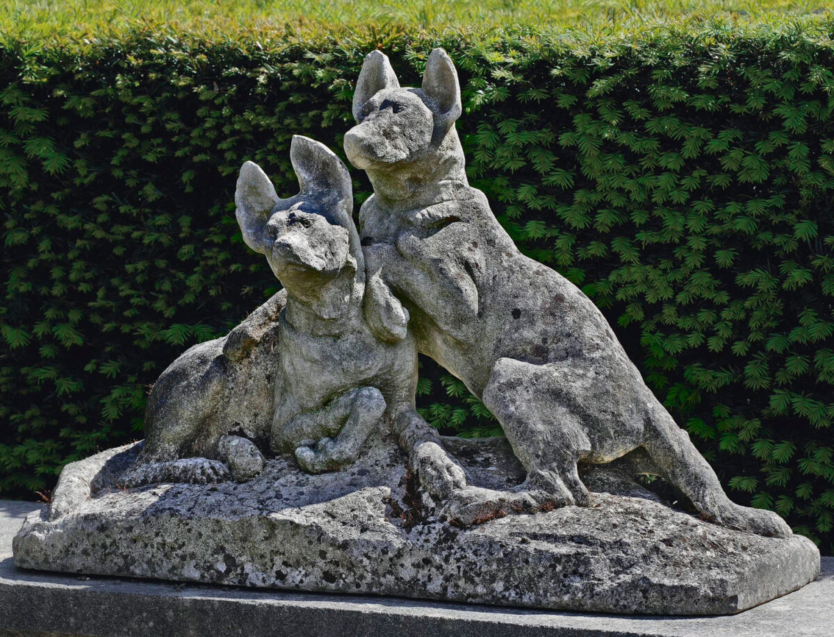Die Komposition zeigt zwei Hunde in einer lebendigen und dynamischen Pose, wobei die Details ihrer muskulösen Körper deutlich sichtbar sind. Die verwitterte Patina und die natürliche Alterung des Steins verleihen der Skulptur einen authentischen Charakter.