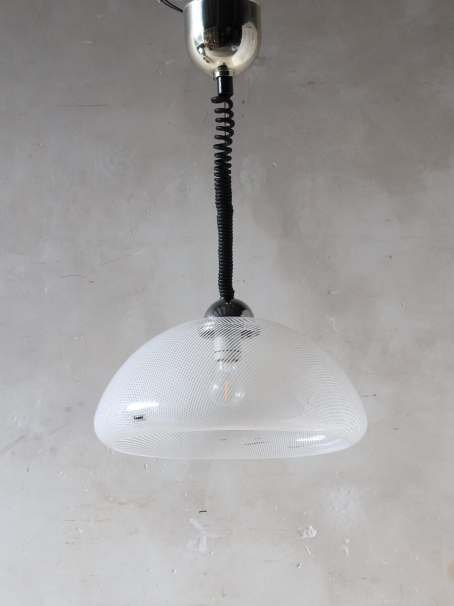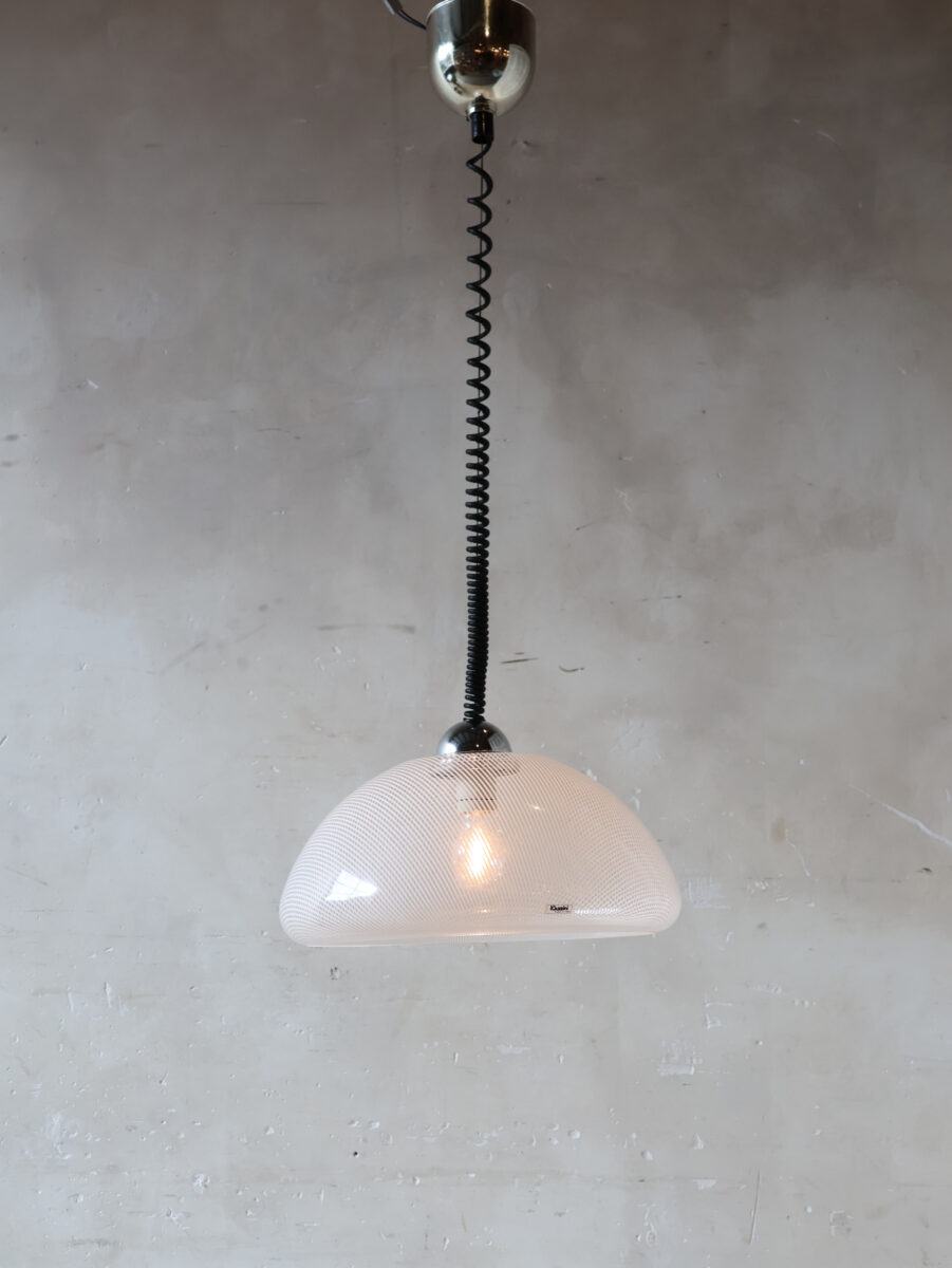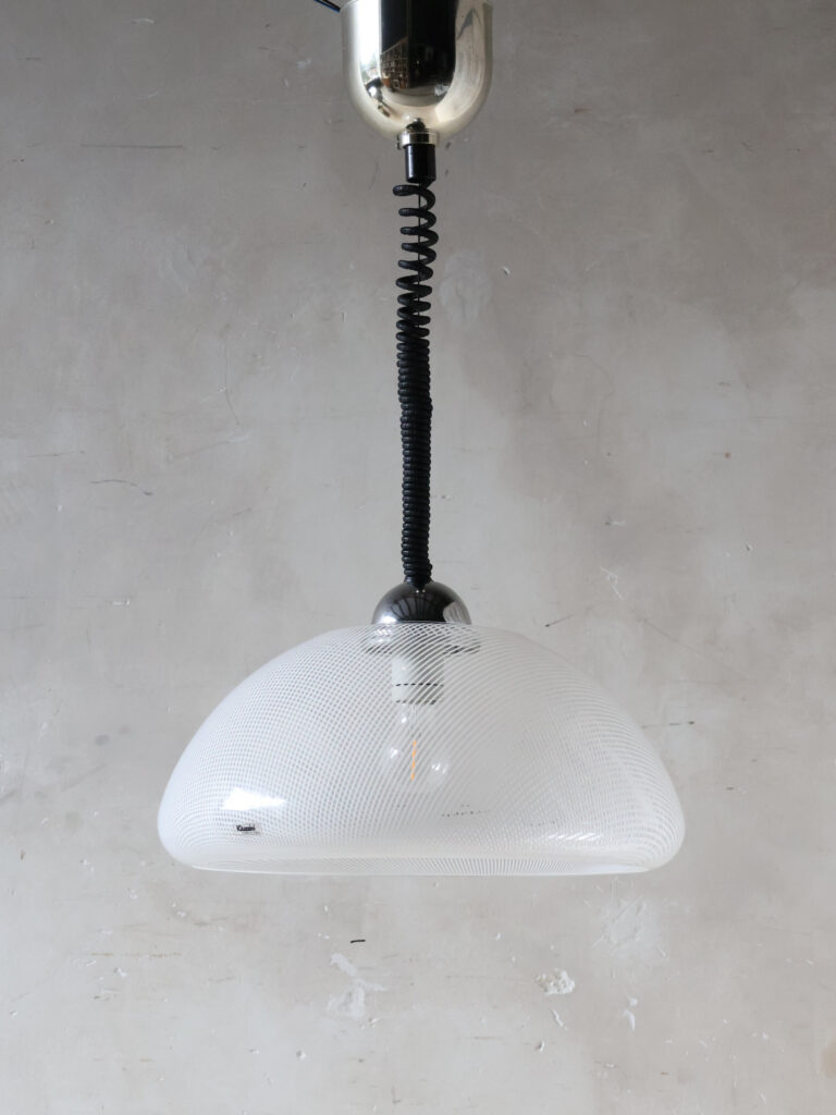 Jede Lampe ist mit einem funktionellen schwarzen Spiralkabel (Zugpendel) und einer glänzenden verchromten Deckenabdeckung ausgestattet, wodurch die Höhe einfach verstellbar ist. Dieses ikonische Stück italienisches Design repräsentiert die dynamische Ästhetik der Epoche und passt perfekt zum Mid-Century Modern, Pop Art oder Space Age-Stil. Ein spektakuläres Ensemble über einem Esstisch, einer Bar oder als stimmungsvoller Blickfang in einem Flur.