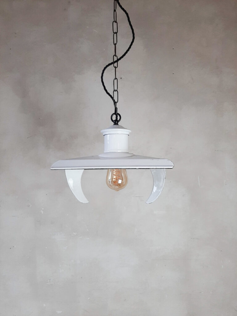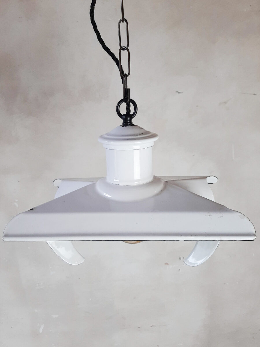 Einzigartiges Set antiker Lampen, schöne Reflektorform in schöner weißer Emaille.