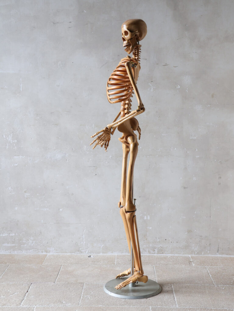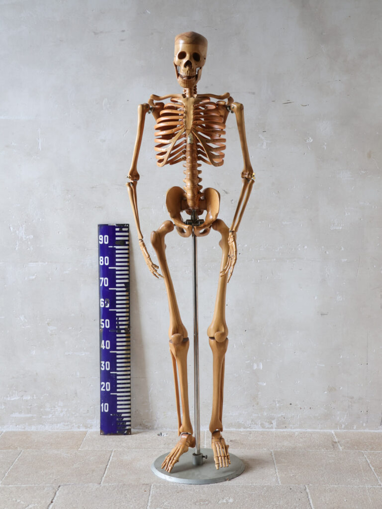 Dieses kunstvoll gefertigte, vintage Skelettmodell aus warm getöntem Holz ist ein echtes Highlight für Liebhaber von Kuriositäten, wissenschaftlichen Objekten und antiken Sammlerstücken. Mit viel Liebe zum Detail und korrekten Proportionen gefertigt, wurde es vermutlich einst als Lehrmittel an einer medizinischen Fakultät oder Kunstakademie verwendet.