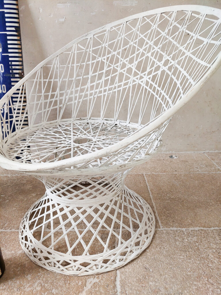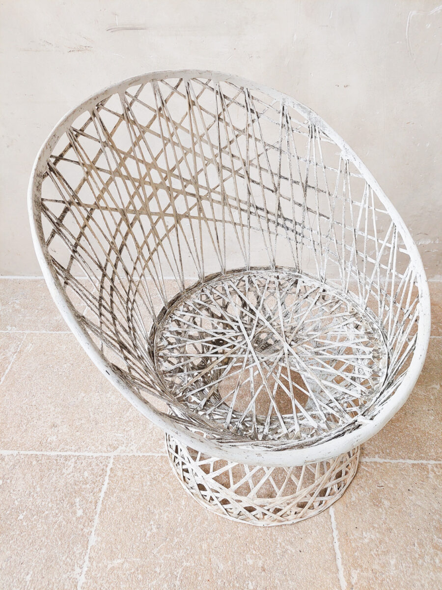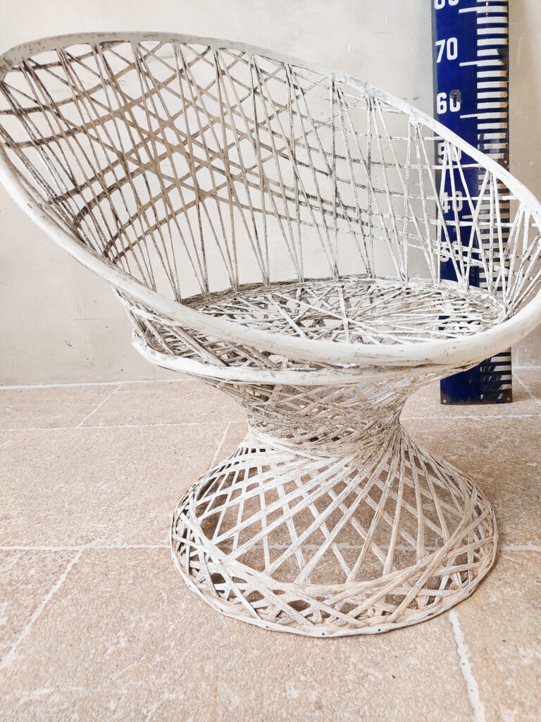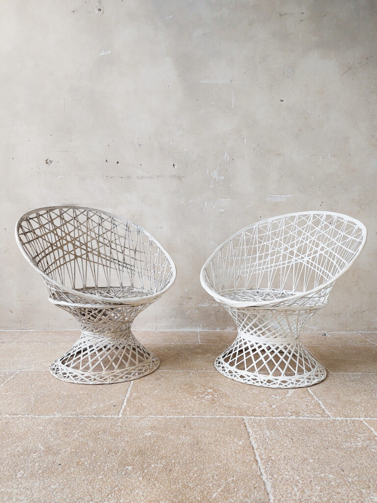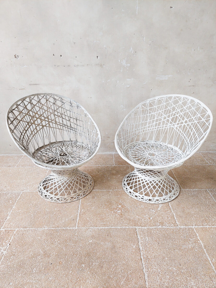 ZweiRussel Woodart Gartenstühle aus gesponnener Glasfaser. Vintage Terrassensessel im weißen Rattan-Stil.
