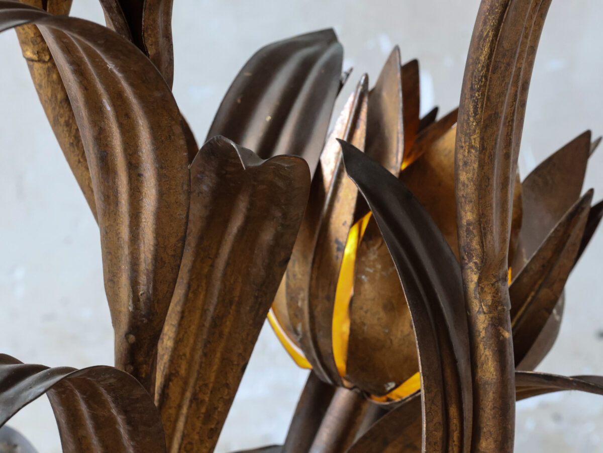 Die Leuchte zeichnet sich durch eine florale Komposition aus sieben aufstrebenden, geöffneten Blüten (Lotus/Tulpe) mit geschwungenen Blättern aus, die auf einem breiten, beblätterten Fuß stehen. Das Metall hat ein warmes Gold-/Bronzefinish und eine natürliche Patina. Die Lichtpunkte in den Blütenkelchen sorgen für einen stimmungsvollen und reflektierenden Lichteffekt. Dies ist ein seltener, skulpturaler Eye-Catcher in ausgezeichnetem Vintage-Zustand.