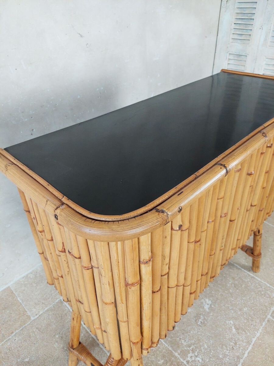 Vintage-Rattan-Tiki-Bar-Set mit zwei Rattanhockern. Stimmungsvolle Bambus-Trockenbar / Cocktailbar mit schwarzer Platte.