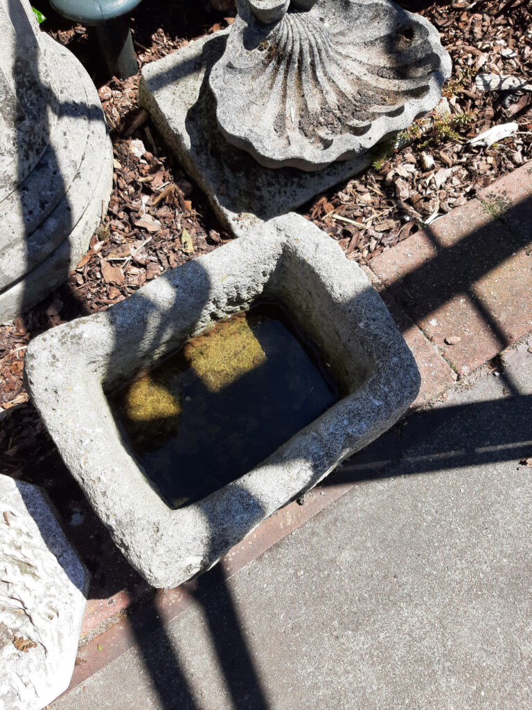 Antiker, von Hand geschnitzter Trog aus Granit, der Wasser fasst.