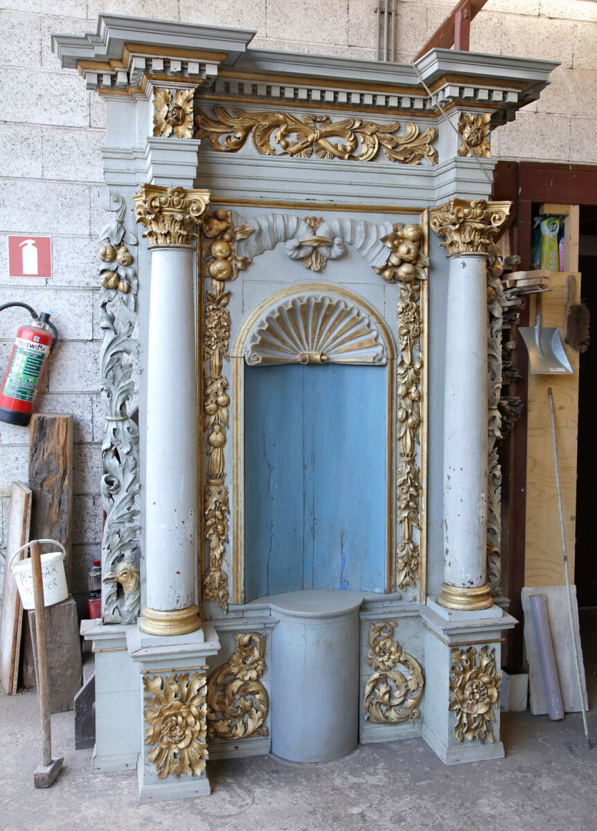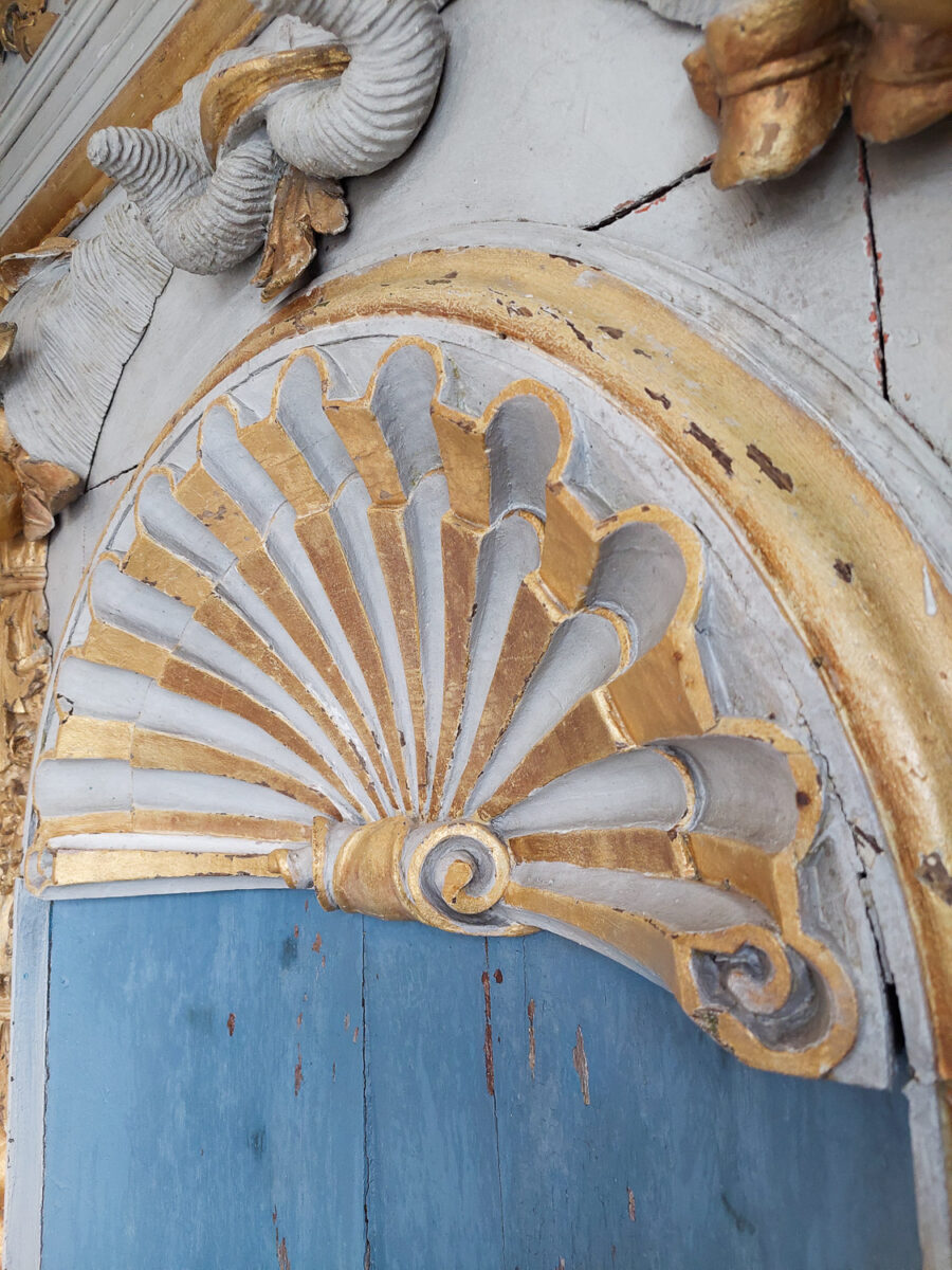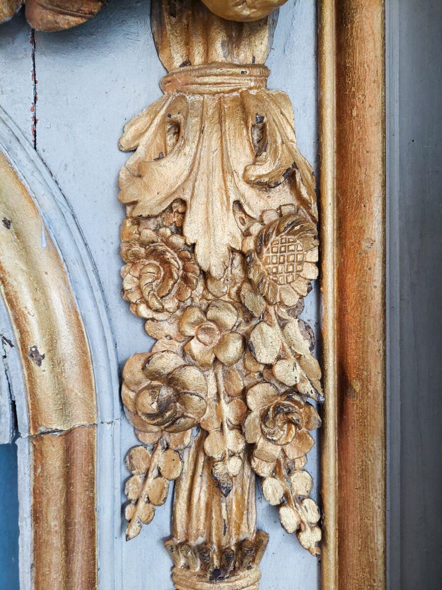 Unter jeder Vergoldung befand sich die charakteristische graue Farbe. Das Blattgold wurde nicht in einem Zug aufgetragen, da es sich um ein teures Produkt handelte. Stattdessen wurde jedes Mal, wenn etwas Geld zur Verfügung stand, ein zusätzliches Stück vergoldet.