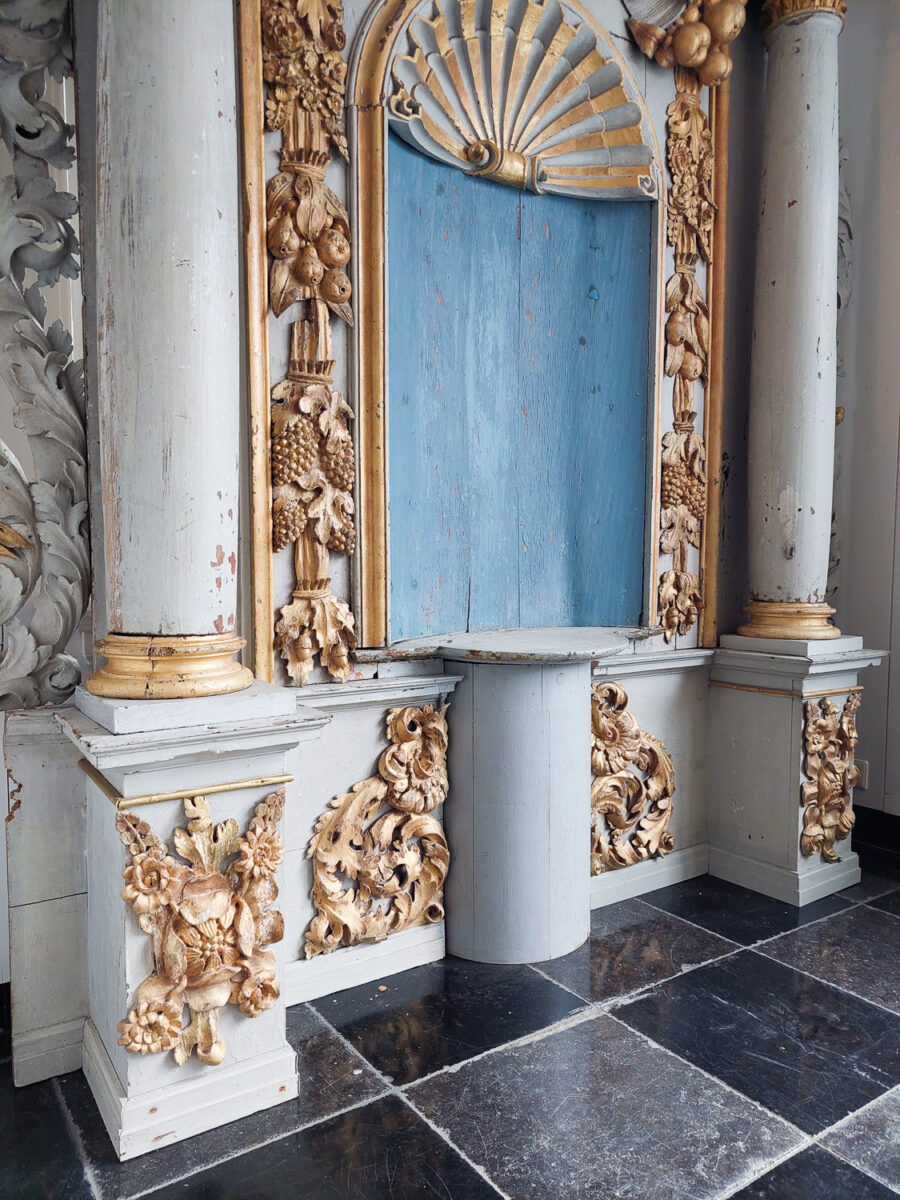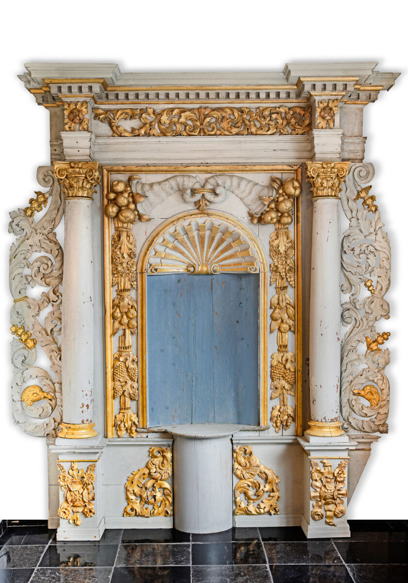 Die Nischen sind jeweils mit einem Paar Säulen mit Kapitellen versehen, die im reichsten Kompositstil (eine Stufe über dem korinthischen Stil) verziert sind. Das Füllhorn, eine markante Jakobsmuschel, Eichenblätter, Weintrauben und ein wunderschöner, großer, nach innen gerichteter Vogelkopf auf jeder Seitenwand sind weitere sichtbare Dekorationen.
