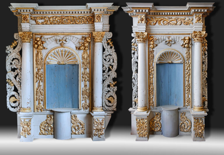 Zwei französische Kapellennischen aus dem frühen 17. Jahrhundert aus geschnitzter Eiche, mit Blattgold vergoldet und in klassizistischer Formensprache ausgeführt.